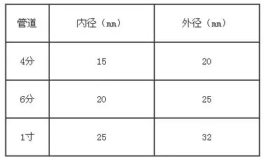 暖氣管道的口徑一般有三種:4分、6分、1寸,其中6分最為常見,4分和1寸較為特殊。三種管徑的內徑和外徑尺寸大小見下表,用戶在選擇前可以提前丈量自家的暖氣管道,避免出現管道與暖氣片不搭配的現象。